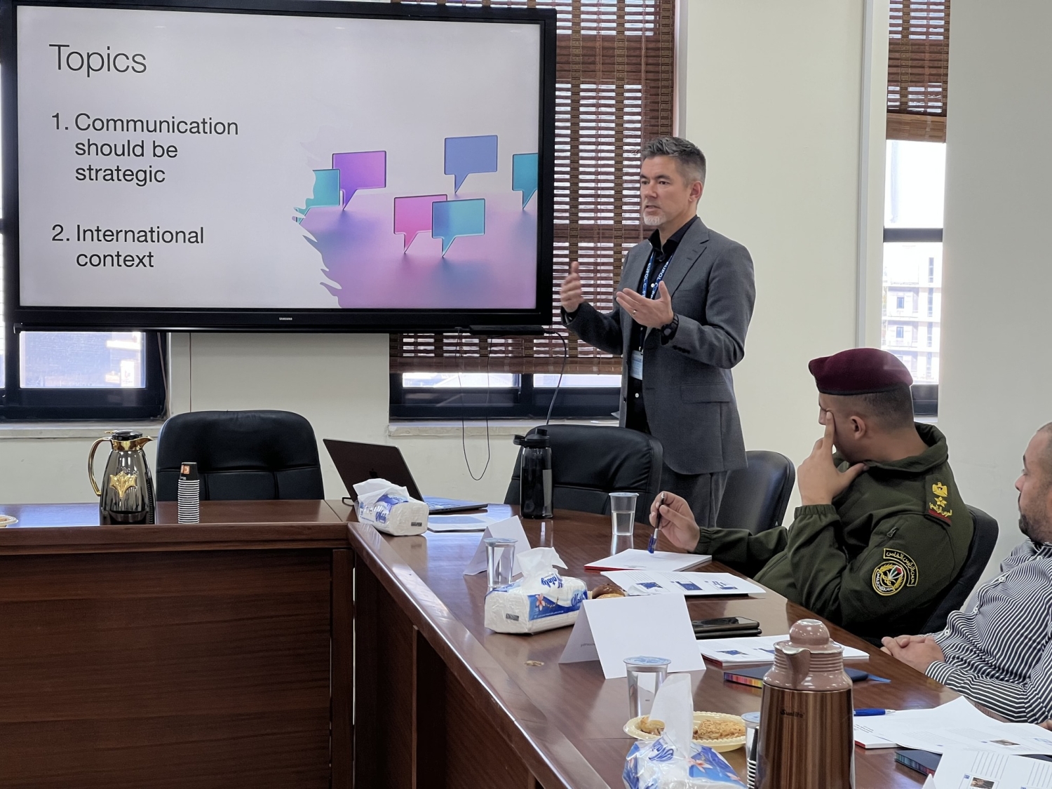هدف التدريب الذي عقد على مدار يوم واحد إلى مساعدة المشاركين على فهم العناصر الأساسية للتواصل الاستراتيجي والتفكير الاستراتيجي، وكيفية استخدامهما في بناء الثقة ما بين الوحدات وأصحاب العلاقة الرئيسيين كالجمهور والشركاء الدوليين. وشمل التدريب محورا عن كيفية استخدام مواقع التواصل الاجتماعي على نحو استراتيجي.